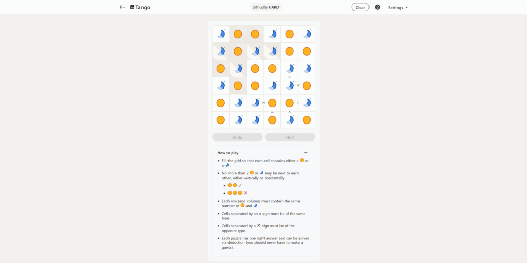 We have 9 pre-filled squares in today’s Tango, and the solution for today is surprisingly fun. It’s not much in terms of difficulty, but I did have fun completing it.