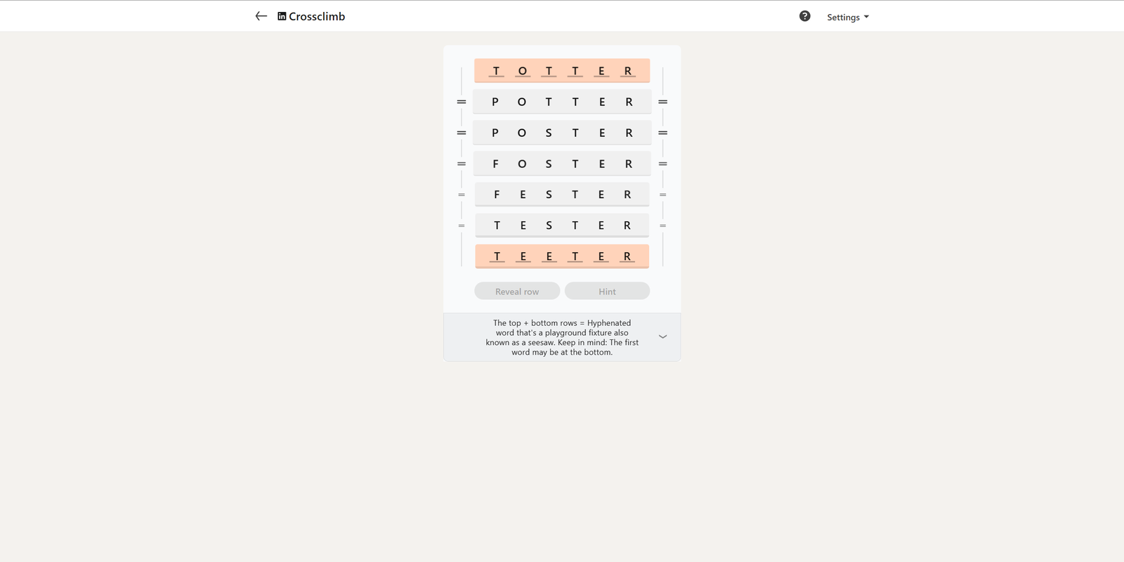 Before finding the last two words, you’ll need to arrange the first five in this order. POTTER, POSTER, FOSTER, FESTER, TESTER.