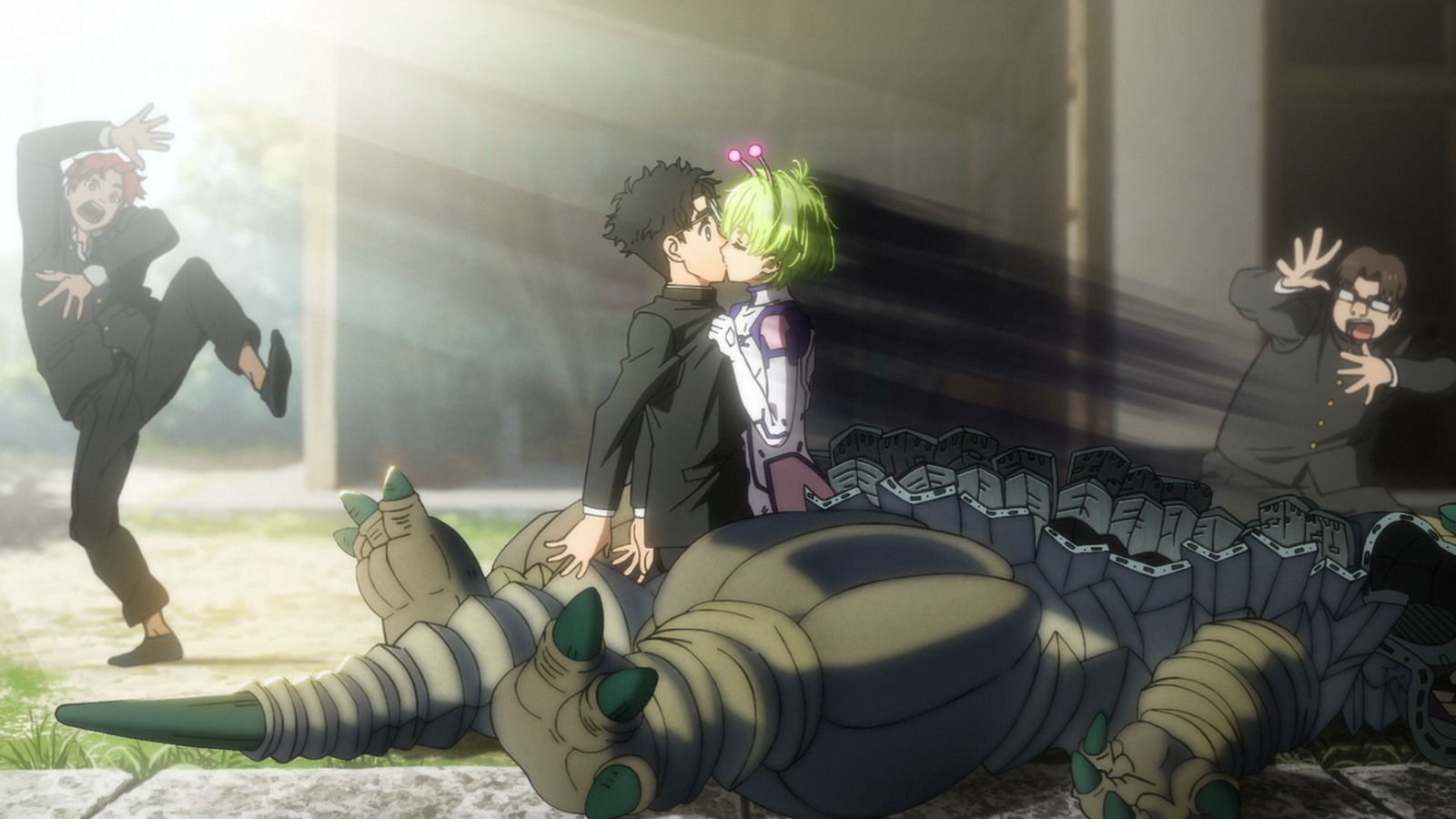 This is when Okarun breaks the Space Kaiju and finds Vamola inside, leading to that accidental-but-legendary kiss that melts Momo’s heart and destroys her house. Classic Dandadan chaos, right?